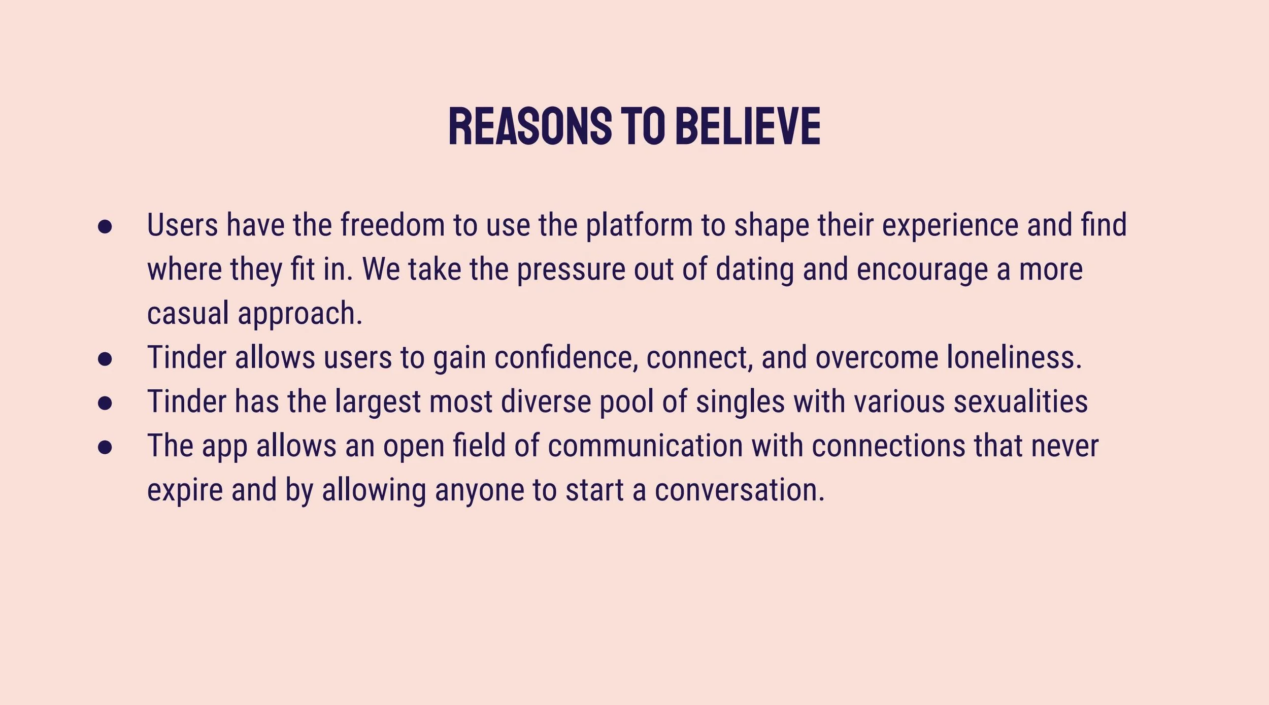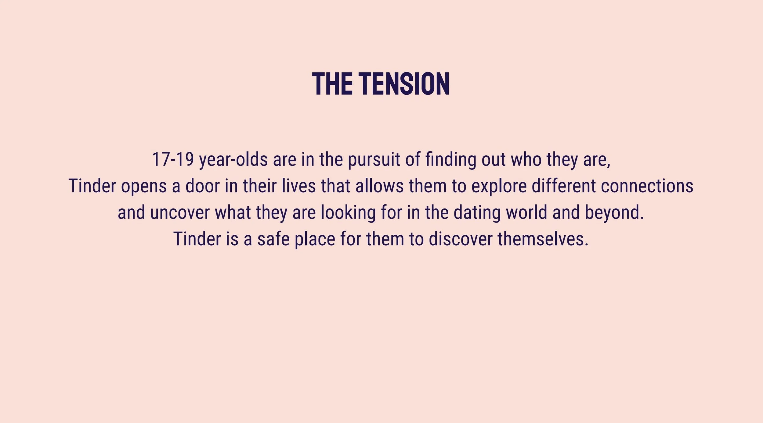 Through qualitative and quantitative research, I began to formulate insights around the culture of dating, perceptions of the app, and its competitive landscape. We learned that Tinder was not only competing with other dating apps, but social apps like TikTok. Through our research we began to discover, Tinder isn’t simply a tool for dating. Tinder is a space for self-discovery, connection, and exploration. Much like our favorite social apps, Tinder provides a landscape that opens the door to different worlds and connection.